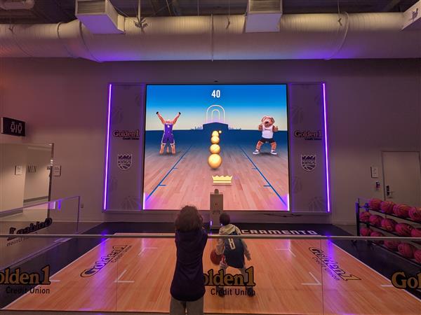 Golden1有一款给孩子们运球的游戏,只要跟随画面的节拍,就可以得到分数。