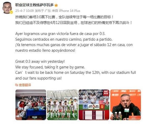 4月7日,重庆铜梁龙客场3-0击败深圳青年,昨日中甲第三轮。赛后,重庆铜梁龙教练萨尔瓦多更新了社会媒体。
