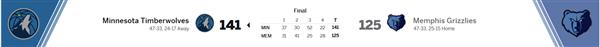 然而,这一切都只是一个梦。狼在下半场和疯狂没什么区别。他在第一个12分钟就投出了85.7%的惊人命中率。他在21次投篮中只丢了3个球,包括7个三分球。无论他站在哪里,他都可以把球投进去。即使他被身体对抗,他也是一样的。全队海灌NBA历史上单节第三高的52分,一路将差距拉开到22分。被打得头晕目眩的主队,虽然最后一节试图反抗,但也无能为力。当缺乏破格的进攻效率和有效的防守时,他们互动叠加分数,直到结束。最后,狼队以141:125拉下灰熊,直接抢进季后赛还是很有前途的。