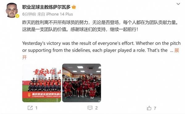4月23日讯重庆铜梁龙的主教练萨尔瓦多发文,庆祝球队在本轮比赛中取得胜利。
