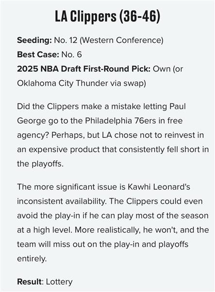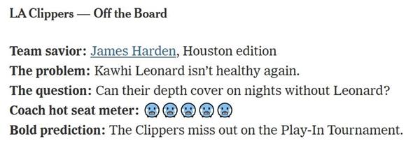 ZachHarper,作为 The Athletic freedaily NBA newsletter,预测季前写八个大字:The Clippers miss out on the Play-In Tournament.