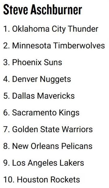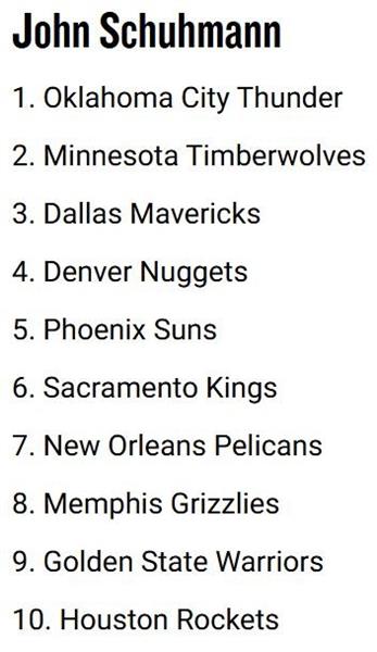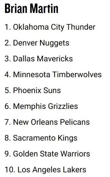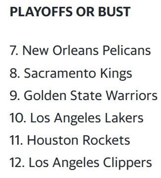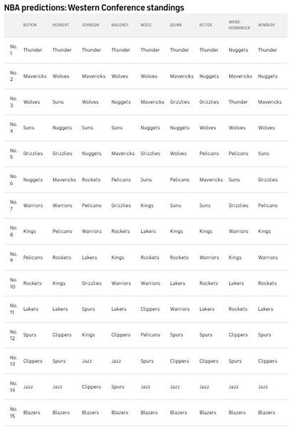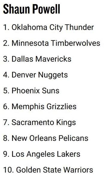 根据 NBA 网站上发表的文章,四位作家 Steve Aschburner, Brian Martin, Shaun Powell, John Schuhmann 在常规赛西区前十名的预测名单中,没有一个 LA Clippers 的踪迹。