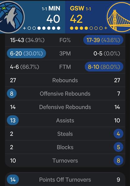 勇士有经验,狼也有经验(去年打西区决赛),但是狼第四节有体力。勇士还有体力吗?也许增加Kuminga 上场时间,或者再次分配球权比例等等,将是勇士在下一场比赛中需要调整的选择之一。