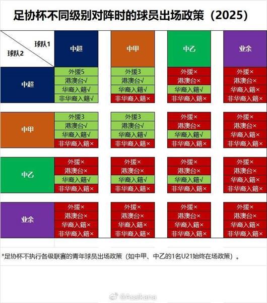 德转的朱艺在社交媒体上介绍了足协杯中不同级别球队对阵时的球员出场政策。中超球队在与中甲球队对抗时,允许使用三名外援,以及港澳台球员和华裔入籍球员参赛,但非华裔的入籍球员则不被允许出场。