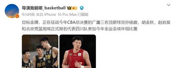 CBA总决赛如火如荼,广厦队总比分3-1领先北京队,影响总冠军指日可待。不过,在CBA总决赛结束前,孙明辉、胡金秋、周琦作为老对手,已经决定联手。他们将代表辽篮苦主四川队参加全运会。而且,广厦三少和周琦已经正式报名参加成人组全运会。根据目前国内球员的实力,周琦、胡金秋、孙明辉、赵岩浩携手并进。纵观国内篮球,恐怕没有人能与之匹敌,夺冠指日可待。