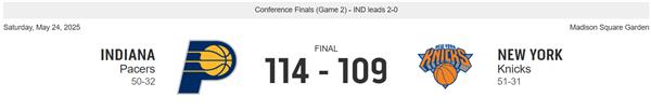 在Siakam和Ben的前半段 Sheppard外线破网后,助队拉开领先到9分,更换阵容后,尼克通过Brunson和Mikall Bridges追分,只是Myles Turner没有给机会,只得到13分,让溜马连续两节得分30分。与此同时,陷入单兵作战的大苹果得分效率逐渐下降。即使失土一度恢复到剩下的3分差距,抢投失败时也只能以连败告终。