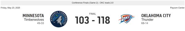 Nickeil Alexander-Walker承包了本节11分,Jaden Mcdaniels也有7分进袋,在终场前4分钟将分差倍减,不过Jaleniels也有7分进袋, Williams末尾挺身助队稳军心,Chet 此刻Holmgren也没有缺席,连续接收Luguentzz Dort两次助攻锁定胜局。雷霆队以118分的成绩获胜。:在103获胜的同时,启动了系列22:0密码,高达90%胜率的历史证据,将成为信心的绝对后盾。