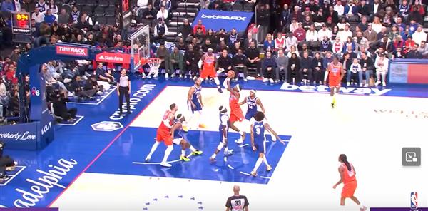 Figure 7. 上图,SGA走到中线,想去他最擅长的罚球区,但MPJ和Joki?立刻挡住路线。