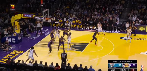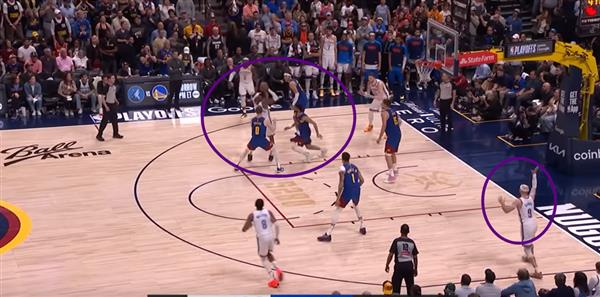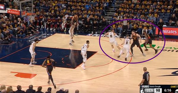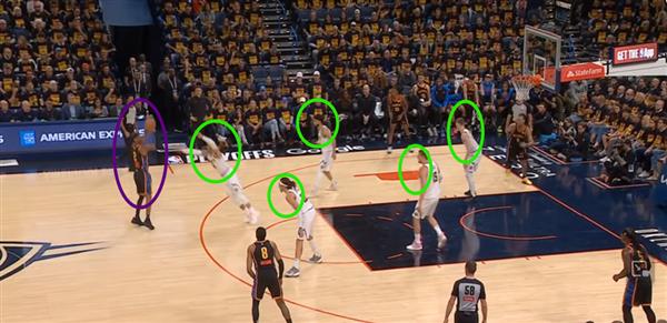 Figure 10. 防范MVP级球员从来都不是一个人的事,能看到Joki吗?Luu完全无视底角 Dort,每个金块球员看到SGA持球直接形成Zone,或者两个进攻球员之间有一个人防守两个人,SGA看到没有地方走,只能投三分。