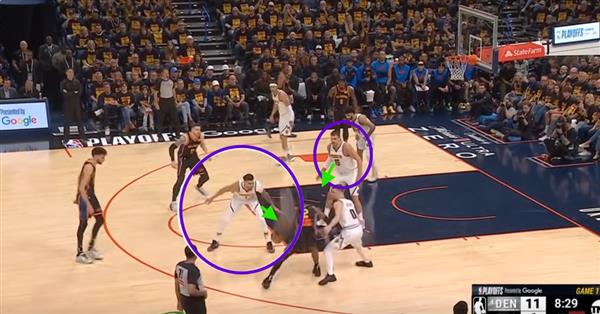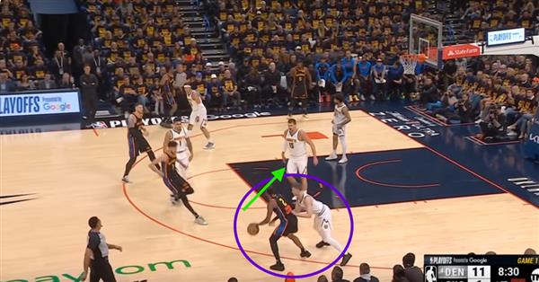 Figure 9. Isaiah在这里 Hartenstein设置掩护让Joki?更换SGA,但是Joki?先跟上掩护,再下沉,让Braun有足够的时间跟上SGA,SGA持球三分不稳定,这样防守也能诱惑SGA投他不擅长的三分球。