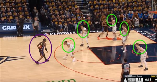 Figure 8. 只要SGA持球,金块就会自动摆出Zone,迫使SGA走中线,在突破的道路上会有很多人等着他,Michaelael Porter Jr.即使是自己防守的球员也不在乎,SGA优先。