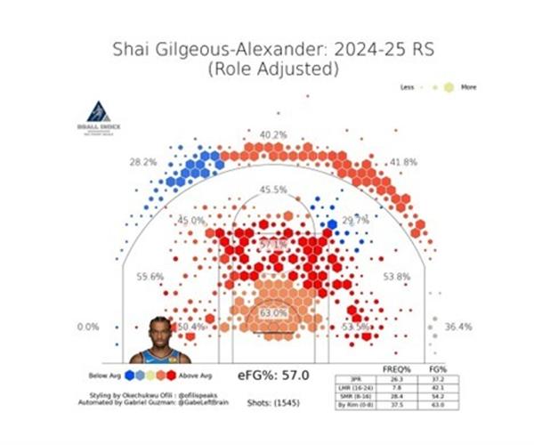 Figure 5. 从SGA常规赛的投篮图可以看出,他的大部分投篮都在油漆区附近,也就是4英尺。 - 18英尺之间。三分产量的命中率是可以接受的,但是产量不足,远中距离的跳投很少出手,油漆区和底线附近的跳投很多,命中率也很高。处理这种以突破为主,攻击性产量在油漆区附近的跳投,防止Giannis Antetokounmpo字母哥那套可以拿出来,中锋蹲在中线赌博突破,双峰线球员踩肘区形成一道人墙,领防人员故意角度逼SGA走中线陷阱。