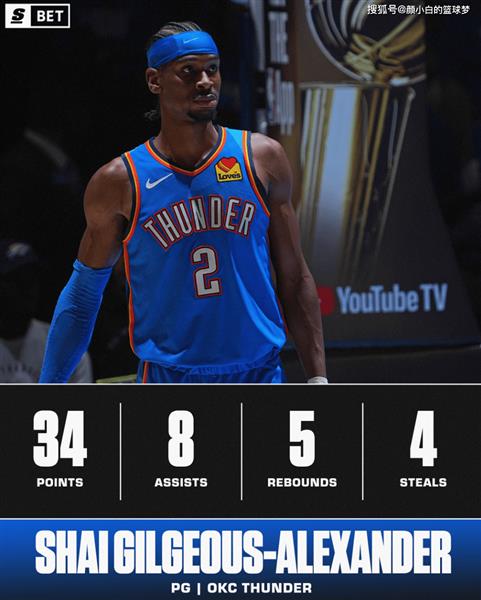 在过去的10场季后赛中,SGA场均32.7分7助攻2.1抢断,命中率50.2%,三分命中率39.5%,真实命中率61.1%,正负值+83。