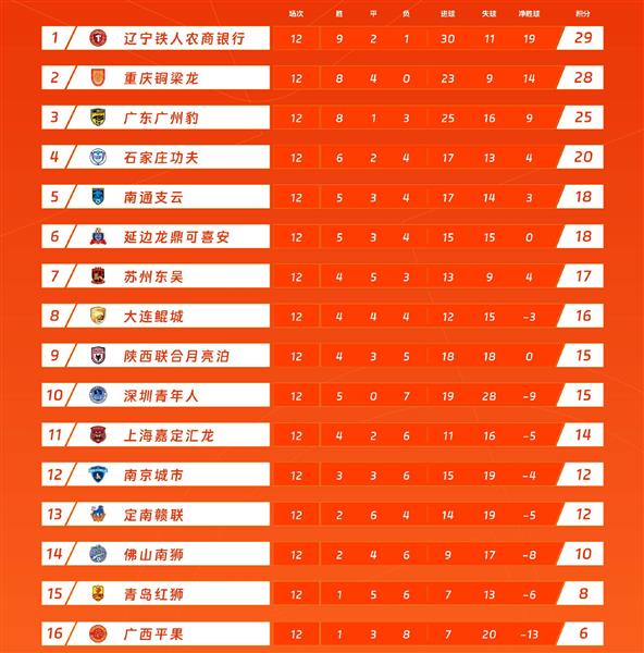 南京市客场1-2不敌前身为黑龙江冰城的定南赣联,遭遇3连败,排名第12。定南赣联两轮不败,排名第13,两队同积12分。