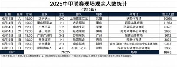 - 06-162025中甲联赛现场观众人数统计(第12轮)