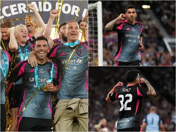 奥脱福体育场周一(16日)举行「Soccer Aid慈善足球赛」,世界明星队5-4击败英格兰,阿根廷球员泰维斯「大四喜」成为世界明星队赢波功臣。曼联呢?「叛徒」全场观众都被球迷嘘声,入波后也没有礼貌反击,把手放在耳后听嘘声挑衅,拉高波衬衫展示自己的个名反击,让曼迷上瘾。