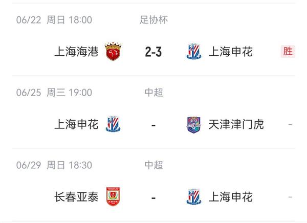 06月22日讯在足协杯1/8决赛中,上海申花以3-2战胜上海海港,成功晋级八强。不到72小时后,申花将在主场对阵天津津门虎,而后者在足协杯中以0-2不敌中甲球队广东广州豹。