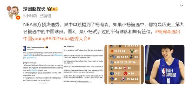 在NBA选秀大会即将开始之际,NBA官方也开始了宣传活动。他们特别提到了19岁的天才中锋杨瀚森,并对他寄予了很高的期望。“如果杨瀚森被选中,他将成为NBA历史上第九位被选中的中国球员。”在他之前,已有八名中国球员被NBA选中,他们是宋涛、王治郅、姚明、薛玉洋、易建联、孙悦、周琦和王哲林。其中,宋涛、薛玉洋和王哲林在被选中后并没有前往NBA征战。