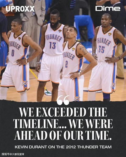 凯文杜兰特、詹姆斯哈登和威少的表现是否超出了预期?很难定义这一点。归根结底,每个人对这个问题都有不同的看法。凯文杜兰特在2011-12赛季进入总决赛时已经23岁了。但别忘了,勒布朗詹姆斯在22岁的时候,带领球队进入了总决赛。事实上,当时雷霆并非只有三少,应该是雷霆四少,还有一位防守顶级的伊巴卡。