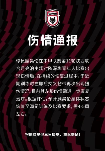 七月八日,据中甲陕西联合俱乐部官方消息,糜昊伦因左膝韧带再次扭伤,需要4-5周才能恢复。