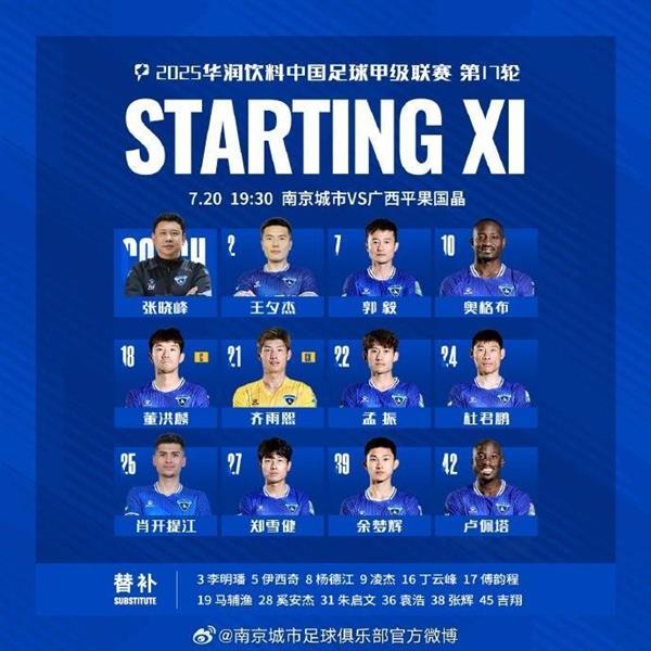 联赛第17轮,南京城市VS广西平果国晶 首发名单出炉,让我们并肩战斗!