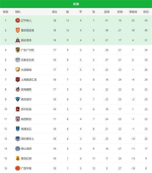 三支球队的积分均为22分。苏州东吴在客场与副班长广西平果战成0比0,暂时排名第十。升班马陕西联合主场以3比1战胜佛山南狮,结束了三轮不胜的局面,少赛一轮后排名第11位。由日本教练筱田善之执教的南通支云则遭遇了两连败,目前排在第12位。