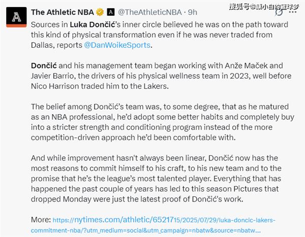 美媒调侃尼克-哈里森让东契奇焕然一新。其实,即使东契奇不被交易,他在今夏也会按照减脂增肌的计划进行训练。这是马切克和巴里奥早已制定好的,只要东契奇愿意配合,他们很快就能帮助他恢复以前的体重。