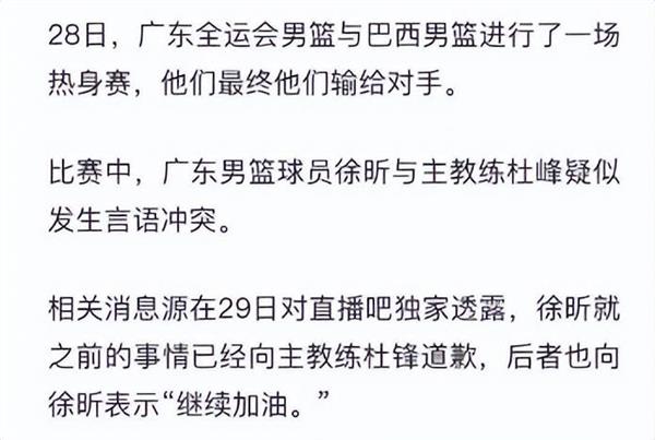 - 07-30徐昕顶撞杜锋冲突后续:徐昕已向杜锋道歉与广东