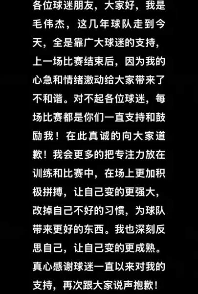 毛伟杰进入瓶颈期。由于战术和外援的原因,他只能接受替补这个角色。他最近一直在挣扎。再加上粉丝的指责,小毛有了不理智的行为。幸运的是,他只有20岁,他可以改正自己的错误。他试图用自己在球场上的表现来证明自己。如果他进了一个球或者助攻了一次,这件事就会翻过来。同龄的朱鹏宇是毛伟杰学习的榜样。从主力中锋到替补,小朱保持沉默,替补上场就有效。