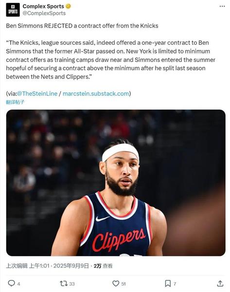 尼克斯球迷呼吁他迅速退役,永远不要在纽约踢球。一些球迷说,继续留在NBA是对篮球的不尊重。尼克斯是为数不多的愿意与西蒙斯签订合同的球队之一。如果西蒙斯拒绝让步,只有退役的方法,因为他不适合在海外踢球。