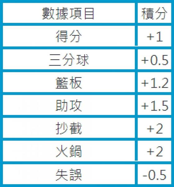 而《FAN PK》除了得分、篮板和助攻,还有三分球、抄袭、火锅和错误。详细的加权系数如下表所示:
