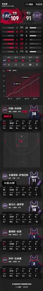 快船:科林斯24分6篮板,洛佩兹16分4篮板,伦纳德15分2篮板2助攻,琼斯12分1篮板,哈登8分3篮板3助攻,保罗8分1篮板10助攻,米勒7分5篮板,祖巴茨4分8篮板4助攻,邓恩4分2篮板3助攻,巴图姆3分3篮板1助攻,鲍德温2分1篮板,尼德豪泽2分1篮板1助攻,布朗2分3篮板,桑德斯2分1篮板,普雷斯顿2篮板1助攻。