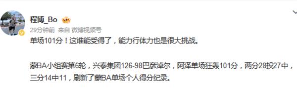 媒体人程博社媒体发文评论阿泽单场101分:即使能力行体力也是一个很大的挑战。