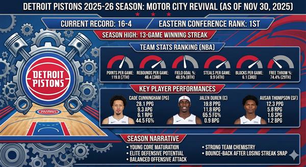 《NBA2025-26:17上赛季在季后赛被尼克淘汰的活塞,本赛季迎来了另一波升级和蜕变。不仅速度推进更好,挡拆系统效率也更显著。平队历史记录的13连胜不容小觑。除了主控Cade 除了Cunningham越来越成熟之外,新一代小魔兽Jalenengham Duren的进步也是最重要的。凭借更加激烈的进攻气焰和防守态势,他们鼓励球队进攻和防守,克服敌人。让我们来看看他们的表现。
