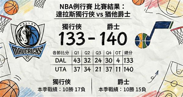 延长赛从George的三罚和外线命中开始。此时此刻,风向已经逐渐转向主队,而不是在正规时间领先的客队。整场外线投射的不尽如人意此刻被无限放大,爵士把人堆在禁区等你进来。Washington勉强投进一球,Flagg除了罚球得不到更多分数。 Markkanen两个关键的进攻篮板补篮,就像丧钟一样冲击着独行侠,爵士终场以140分:133让纪录之夜留下遗憾。