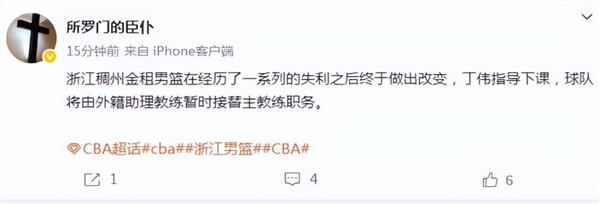 根据媒体人所罗门的消息,浙江男篮在经历了一系列失利后终于采取了措施,主帅丁伟已被解职,外籍助教亚历山德罗斯·法莱卡斯将暂时担任主教练一职。然而,这一消息尚未得到浙江俱乐部的确认,可能很快会有官方公告。