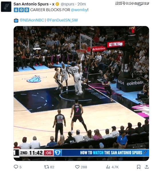 600封盖里程碑!文班亚马大显神威,助马刺六连胜