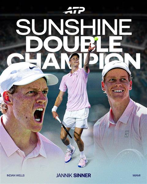 辛纳在印第安维尔斯站两周前获得冠军,到目前为止,他的职业生涯首次在同一年获得阳光双冠。