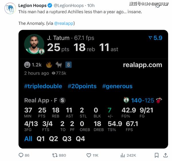 美国媒体LH写道:这位球员不到一年前刚刚遭遇跟腱撕裂,表现太离谱了。